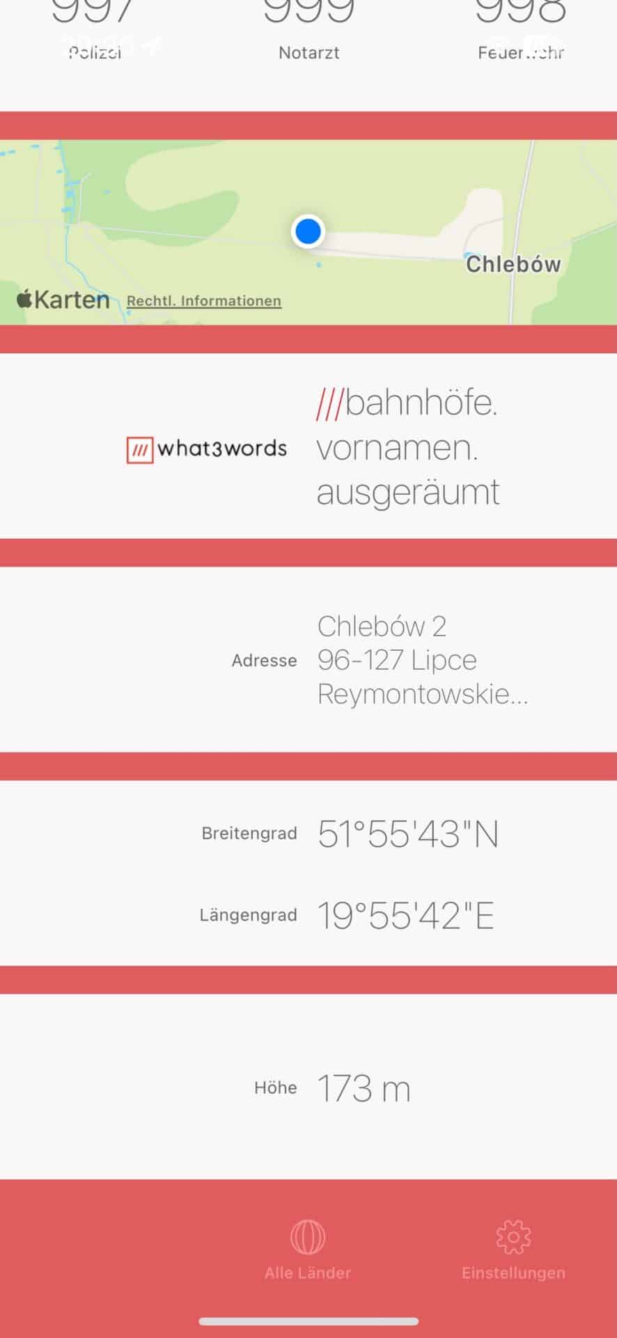Sobald die App geöffnet wird, sucht sie euren aktuellen Standort und zeigt euch den genauen Standort mit Adresse, what3words (nutzt das wirklich jemand?), sowie die GPS Koordinaten mit Höhenangabe an. Am oberen Bildschirmrand findet ihr direkt die Notrufnummern für das jeweilige Land. Hier könnt ihr die Nummern auch direkt anklicken und so einen Notruf absetzen.