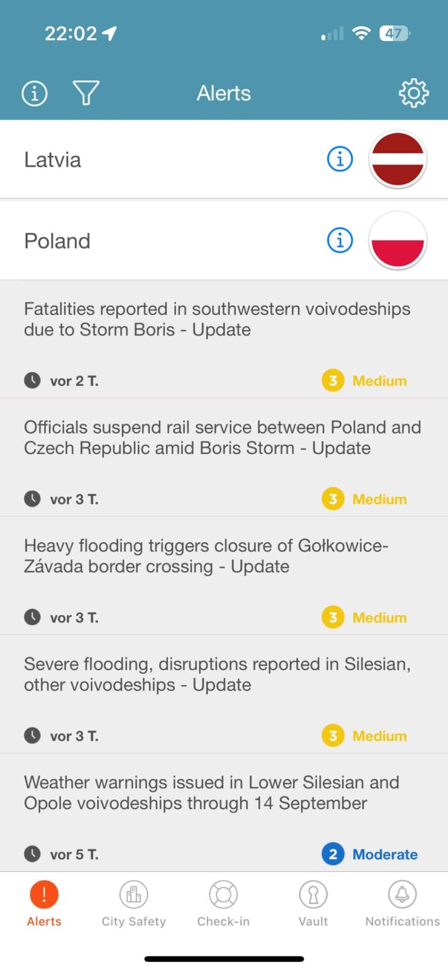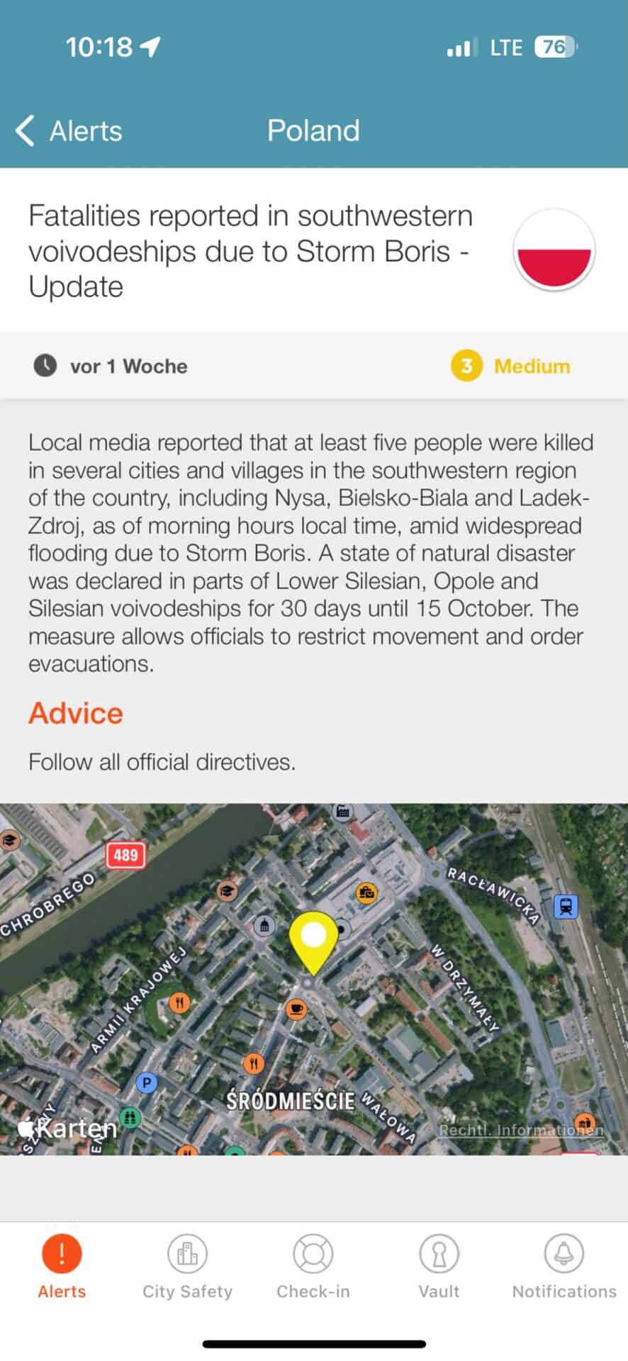 Die Warnungen werden in verschiedene Kategorien einsortiert und man bekommt auch detaillierte Informationen zu jedem Punkt. Zwar kann die App die lokalen Informationsdienste nicht ersetzen, aber man bekommt Änderungen der Lage durch die App überhaupt erstmal mit und kann sich dann weiter informieren. Die Warnungen reichen dabei von Naturkatastrophen über Aufstände bis hin Bombenentschärfungen.