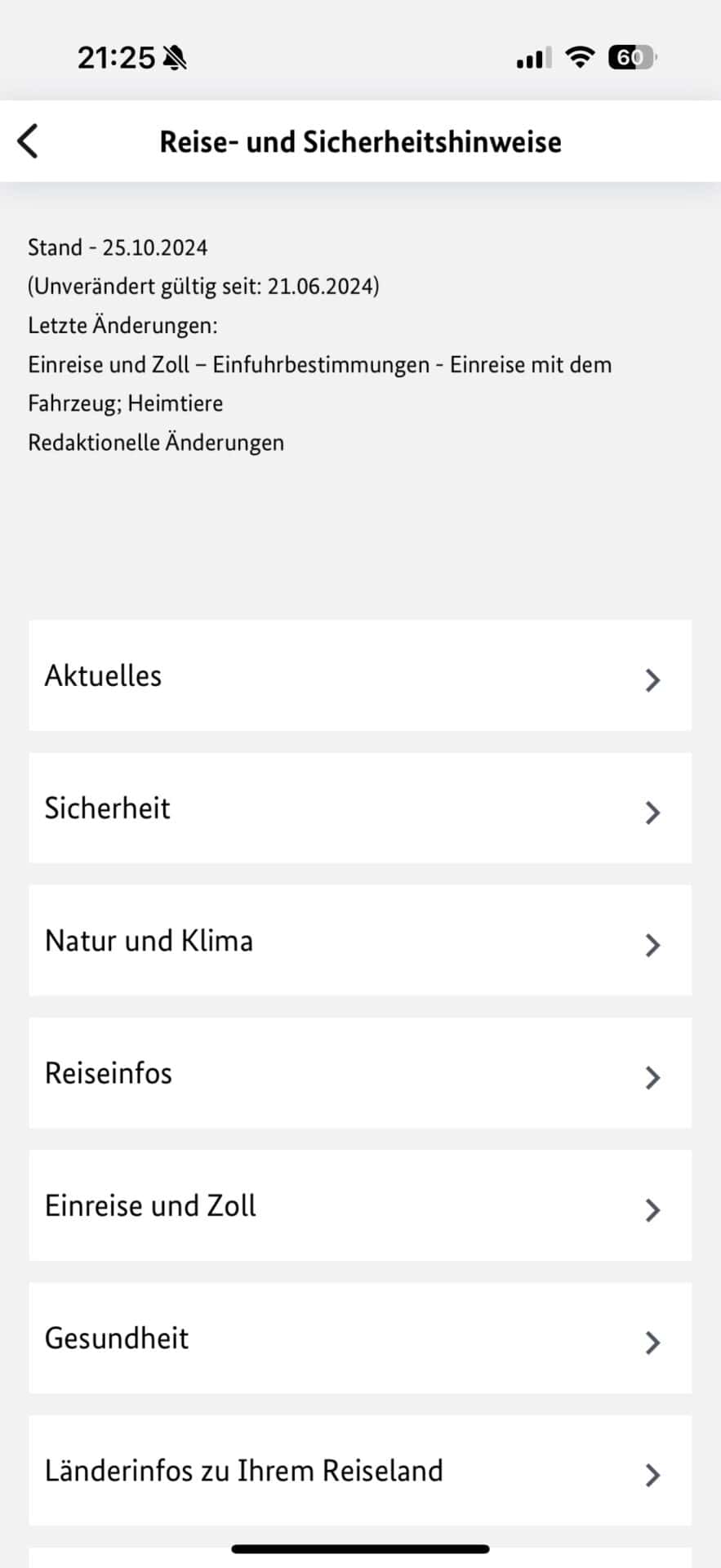 Diese App ist vermutlich eher für Reisen in nicht alltägliche Ziele interessant. Auch erfordern die Meldungen des AA immer ein wenig Einordnung durch einen selbst. Das AA gibt einem aber alle nötigen Informationen, um die Sicherheitslage eines Landes selbst beurteilen zu können. Doch selbst wenn es nicht um Sicherheitslagen geht, sind die Daten der App durchaus wertvoll. So findet man unter dem Punkt Einreise und Zoll wichtige Details zur Ein- und Ausfuhr, sowie der Einreise mit dem Fahrzeug, was gerade für uns Camper durchaus wichtige Punkte darstellt.