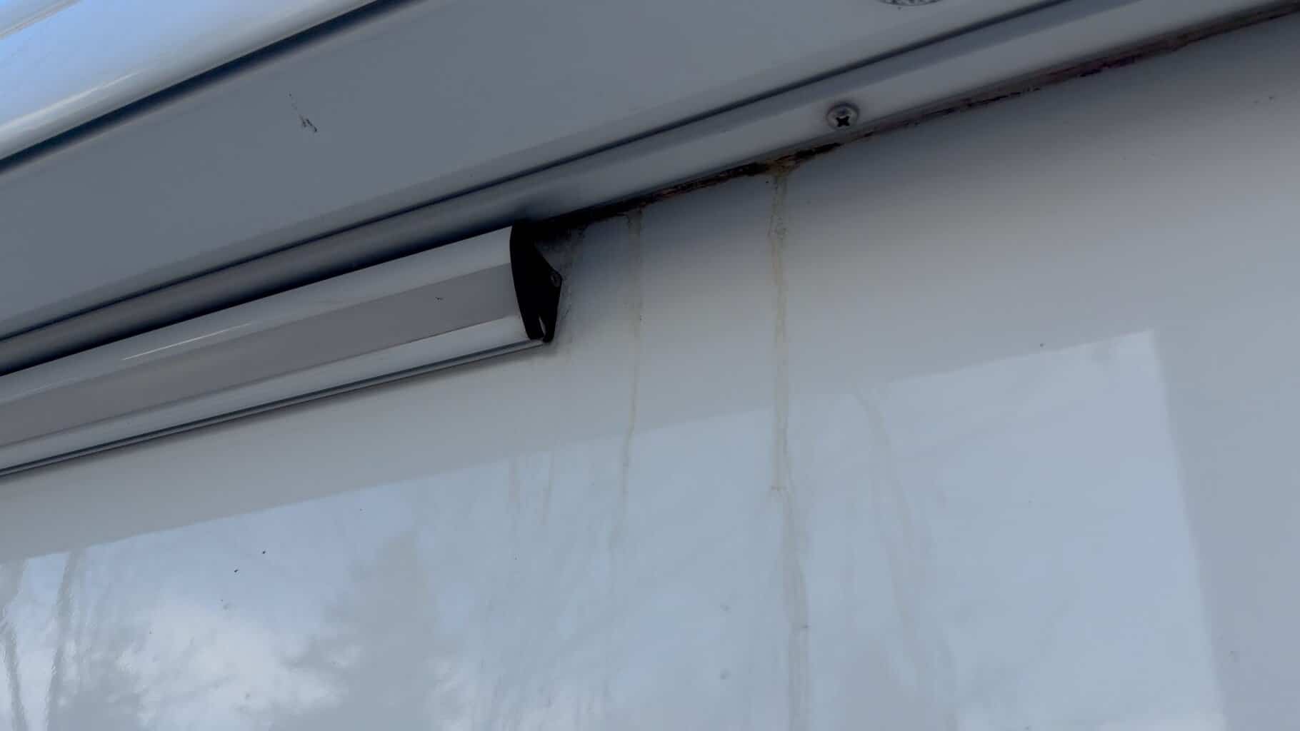 Gemeint ist der Regenablauf, also der Schlitz, über den Wasser und Dreck ablaufen sollen. Wenn da Schmodder drin sitzt, bleibt Feuchtigkeit stehen, es riecht schneller muffig und du hast eine Schmutzfalle, die du von außen oft nicht siehst. In der Praxis wird genau dieser Bereich bei Markisen Pflege Tipps regelmäßig als Reinigungsstelle genannt, denn auf den Bilder siehst du bereits den Schaden, den Wasser hinterlassen kann. Ich selbst müsste hier wieder neu verfugen.