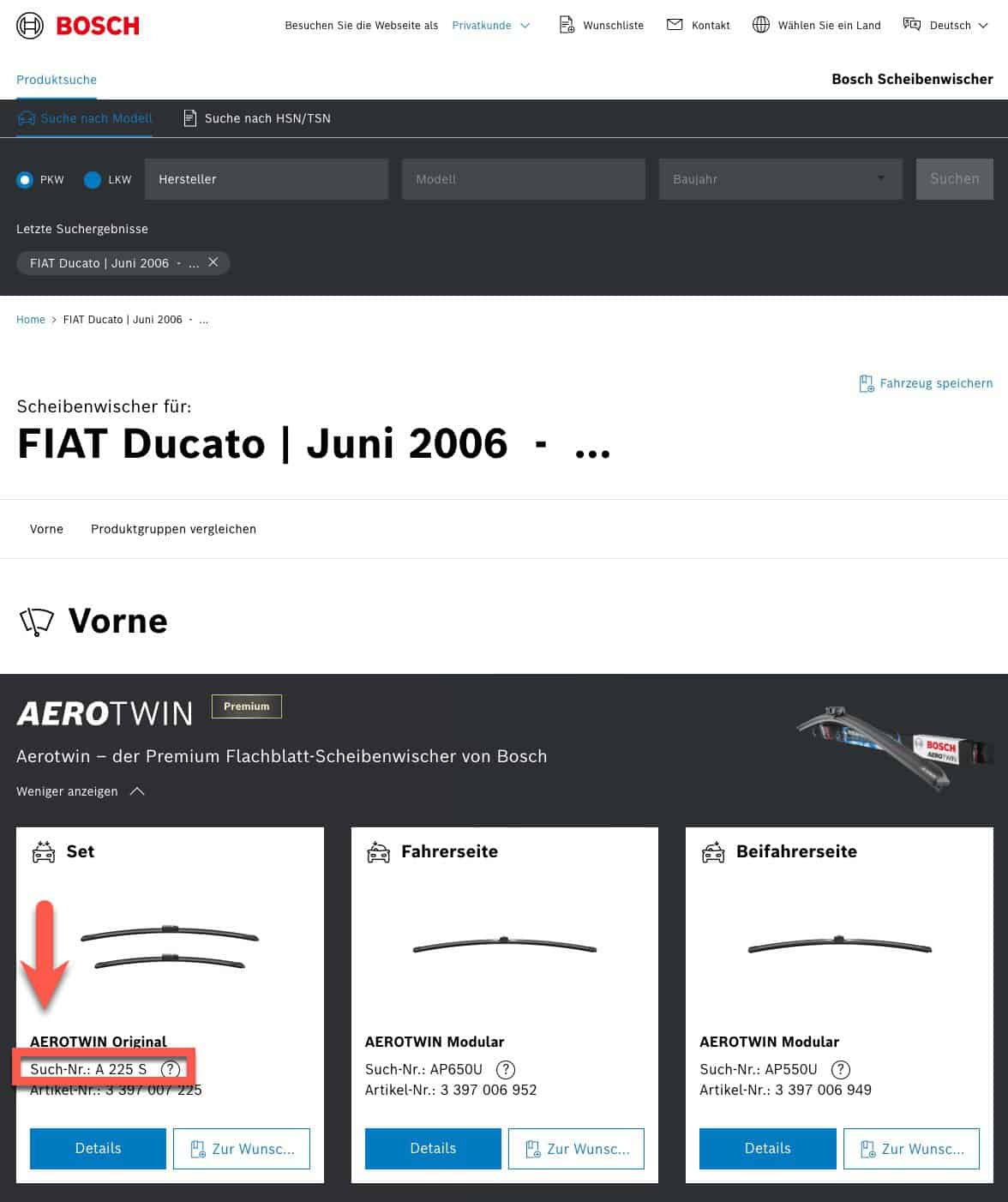 - Fahrzeugdaten auf der Bosch Webseite eingeben.