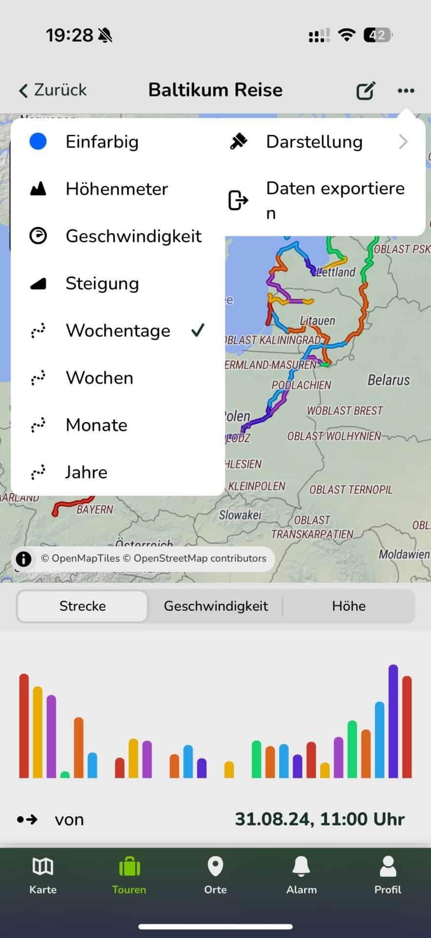 Die Tracks können anschließend einfach über das Eingrenzen des Datums zu Touren zusammengefasst werden. Bei diesen kann man dann diverse zusätzliche Informationen bekommen und auch die ganze Tour in verschiedenen Formaten exportieren.