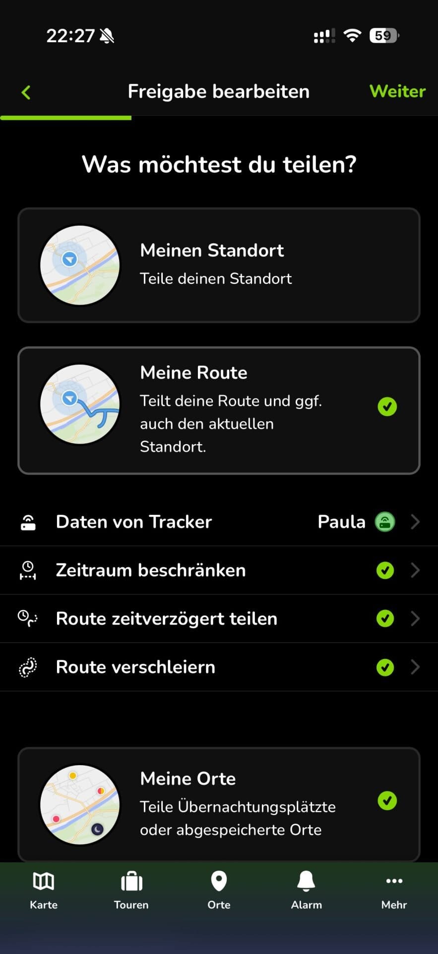 Mit dem Feature könnt ihr euren aktuellen Standort, die gefahrene Route und eure Übernachtungen an eure Freunde und Verwandten freigeben. So können daheim gebliebene eure Route verfolgen und sind immer auf dem Laufenden. Auch für den Fall, dass etwas passiert, ein tolles Feature. Auch, wenn wir alle natürlich hoffen, dass nie was passiert.