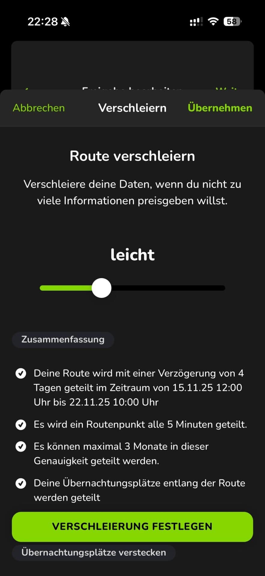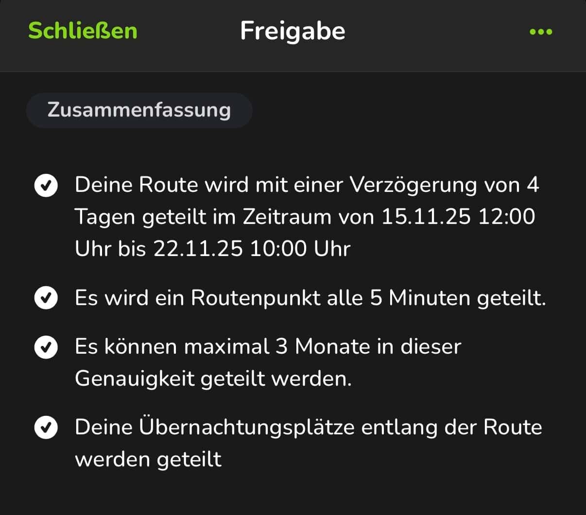Doch das ist nicht alles. Ihr könnt eure Route zusätzlich verschleiern, mit einem Passwort versehen und verzögert teilen. All das voll DSGVO-konform. Das ist natürlich ein praktisches Feature, wenn man die Reise mit einer fremden Community teilen möchte. Damit kann man die Route so teilen, dass niemand genau weiß, wo ihr unterwegs seid, oder wo ihr euch gerade im Moment befindet.