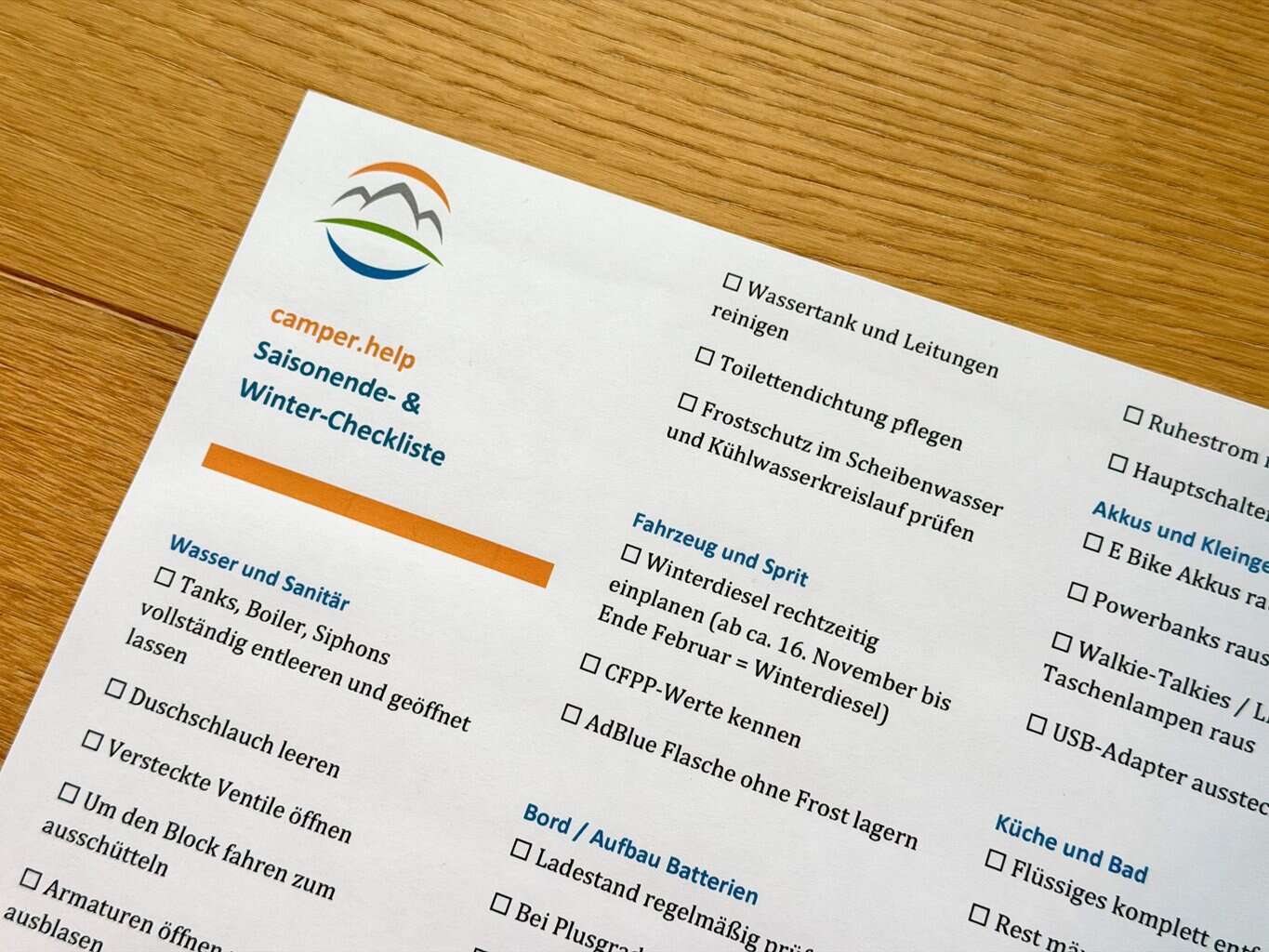 Diese Liste wird nie komplett. Jeder Camper ist anders. Jeder hat andere Gewohnheiten und eine andere Ausstattung. Die einen so und andere haben Alpencamping im Dauereinsatz und andere stellen das Fahrzeug im Dezember einfach nur auf den Parkplatz vor dem Haus.