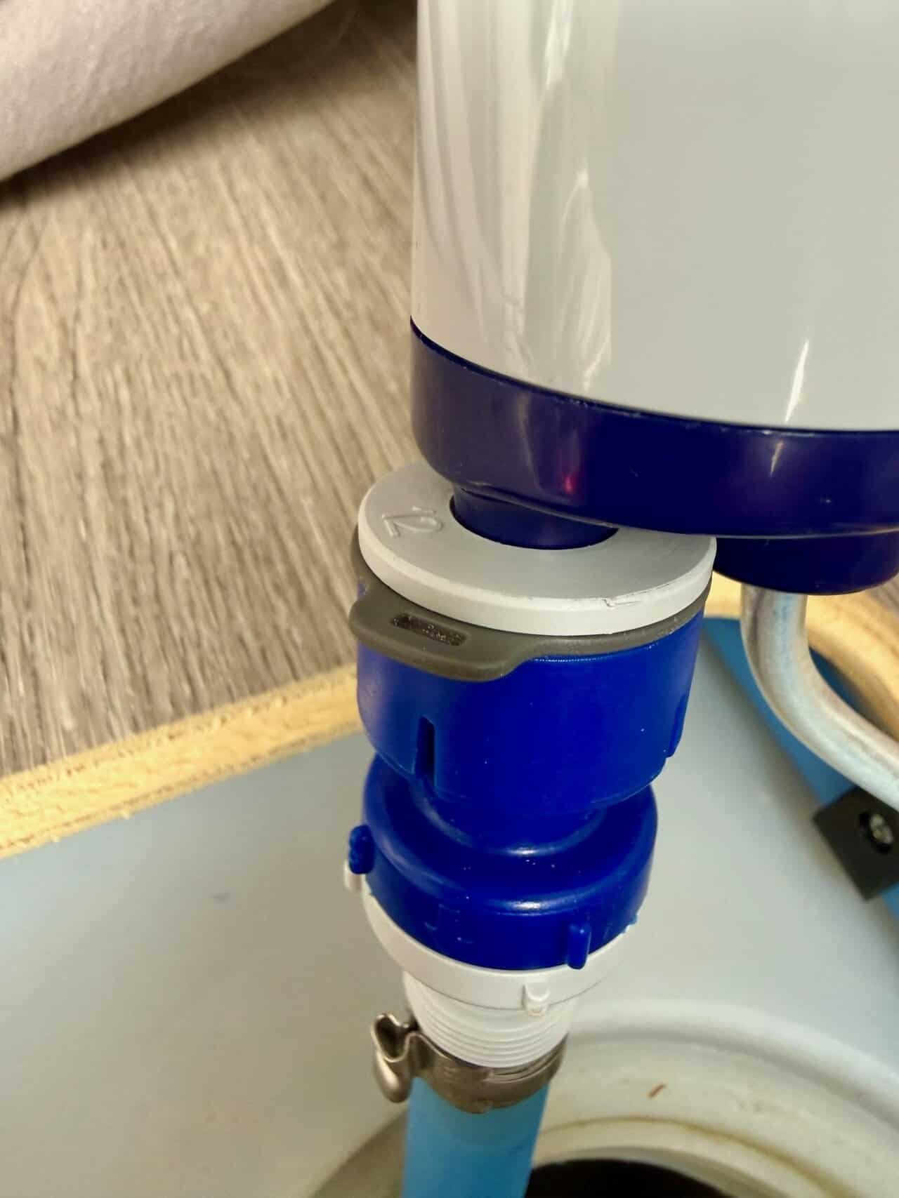 Zuerst zieht ihr den grauen Ring vom Ventil und dann drückt ihr den weißen Ring in Richtung Ventil. Das gibt euch die Pumpe frei. Die Funktion ist genau, wie bei den Verbindern des WM Aquatec UV-8 Sets. Wichtig ist es nach dem Tausch der Pumpe den Ring wieder einzusetzen. Dann sollte auch alles dicht sein und auch dicht bleiben.