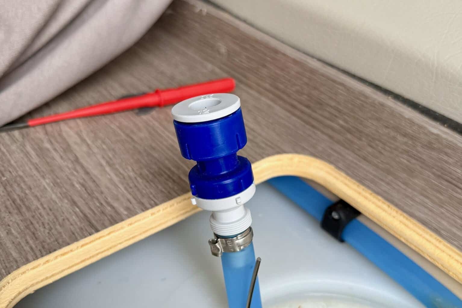 Am wichtigsten ist es alle aufgeführten Teile bereitgelegt zu haben, dann klappt der Einbau auch zügig. Zusätzlich zu den oben aufgeführten Teilen benötigt ihr noch etwa 1-2 Meter Schlauch, Schlauchschellen und mindestens einen Schlauchverbinder. Davor solltet ihr prüfen, welcher Schlauchdurchmesser bei euch verbaut ist. In unserem Pössl 2-Win S ist das 10mm. Eventuell können euch auch Kabelbinder helfen. Die sollten ja aber bei den Meisten zur Grundausstattung gehören.