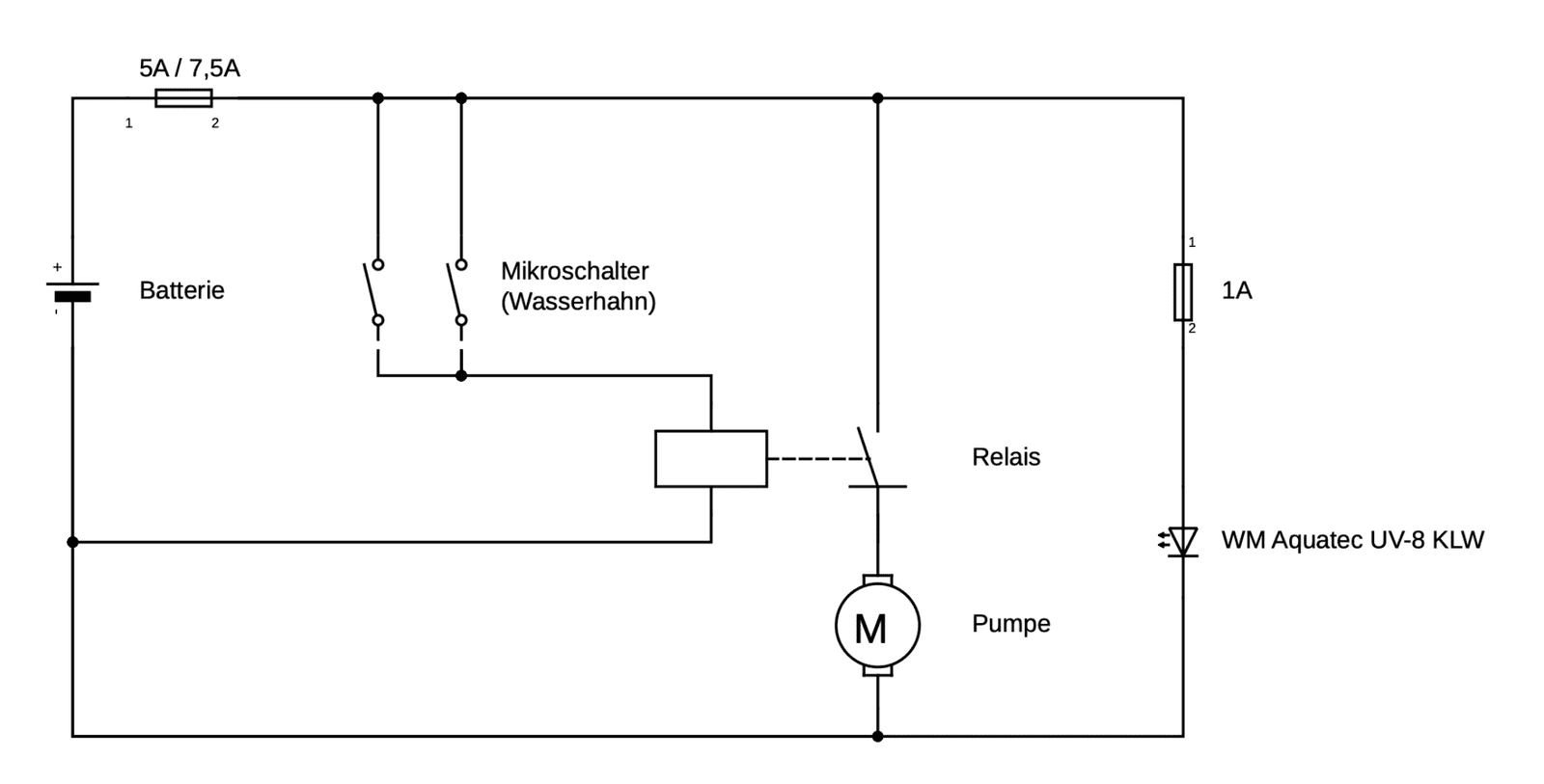 Mit dieser Schaltung wird über die Mikroschalter also nur noch die Spule des Relais geschalten, das einen recht geringen Strom benötigt und somit keinen nennenswerten Lichtbogen erzeugt. Die Pumpe selbst wird über die deutlich robusteren und einfach zu ersetzenden Kontakte des Relais geschalten.